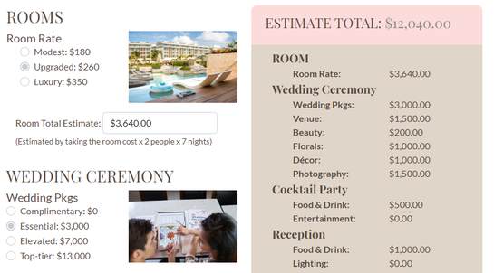 Customized to you: Whether you picture a small, intimate ceremony or a big, fabulous celebration, the calculator adjusts to your vision and your budget.