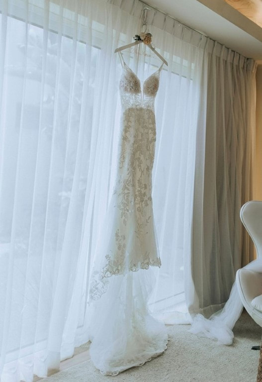 It was pretty easy to travel with my wedding dress. I carried it on in the garment bag. Since the garment bag was “too long” to go through the x-ray machine at TSA, they did have to hand check it which took a while and almost made us late to our flight. However, on the way home, I folded the garment bag up before carrying it through TSA and fit it perfectly in the bin with no issues. The first plane stated they had nowhere to store it so I just laid it on top of the bags in the overhead bin and it was fine. The second flight was very accommodating and placed my dress, and my matron of honor’s dress, in an overhead bin by themselves to ensure they did not get damaged. I took a small carry on steamer to the resort for my bridesmaids and the resort provided me and my fiancé with free steaming of our attire. They took our attire the day before the wedding in the morning and brought it back after they steamed them. It was an easy process.