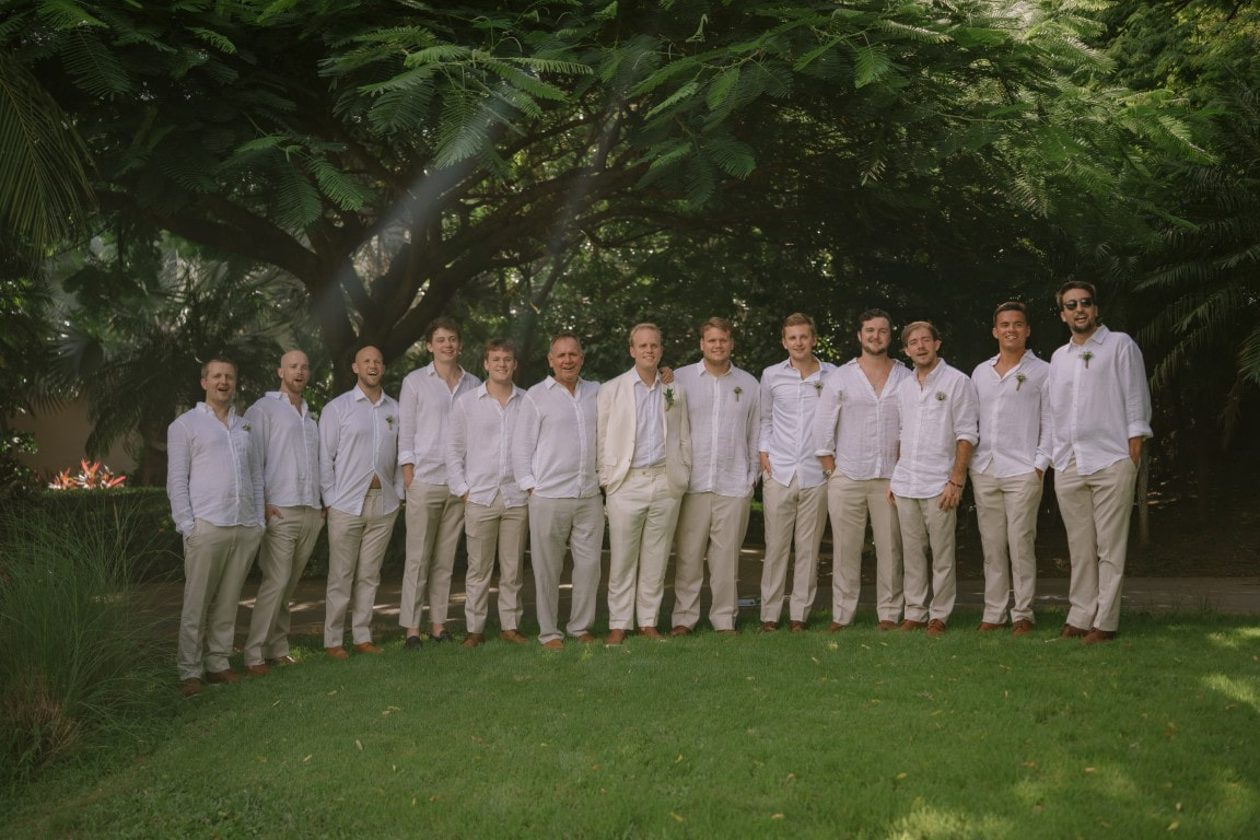 Groomsmen: We had the groomsmen wear matching tan pants from Men's Wearhouse, and a simple white linen shirt.