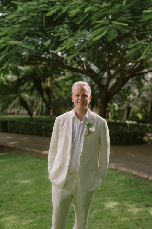 Groom: Evan wore a custom, ivory Indochino suit, with a white linen shirt, and Allen Edmond loafers. It was the perfect Beach Wedding look.