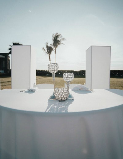 I think honestly my biggest fear was that the wedding was going to be too simple. We opted to go pretty simple with the decorations because it was an outdoor wedding and really what’s more beautiful than being able to see the beach and the mountains in the same view? We didn’t go crazy with the tables - white linens, white chairs and a flower centerpiece to match the colors of the bridal party. I have to say, I’m so glad I was wrong about my concerns. As simple as it was, it was absolutely perfect. The color changing columns were awesome as it got dark out. Hard Rock did an amazing job making simple look so elegant.