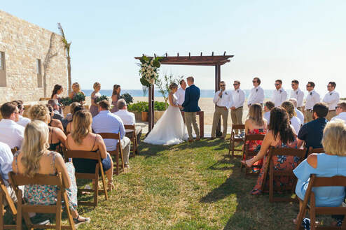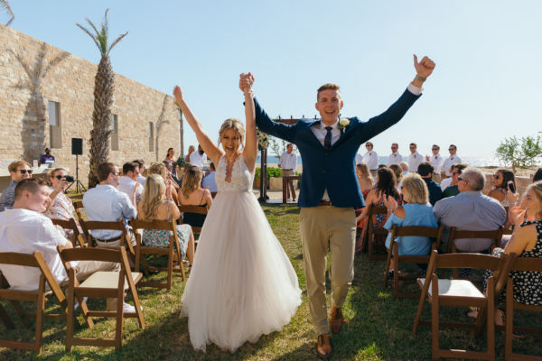 We chose a destination wedding for it to be a little less traditional than a wedding we'd host at home, but we still ended up with a pretty standard cadence of events on our wedding day. Our ceremony was officiated by my husband's father, lasted no more than 15-20 minutes, and we used music from Spotify for it all (low key!). After the reception, our guests were led up to our reception location for a cocktail hour with light appetizers. After that, the bridal party entered, we cut our cake, and were served dinner with speeches in between each course. Our wedding coordinator was insistent that we wait until sunset to start our first dance, so the dinner portion felt like it lasted quite a while but as soon as the dancing started – it never stopped! We had no formal events or activities as soon as dancing started (no bouquet toss, garter toss, etc), but ended the night with a whole-group karaoke session which was the most memorable part of our whole wedding.